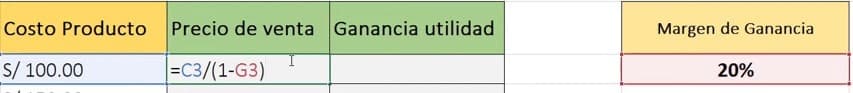 👉Sacaremos el precio de venta con la celda del costo de producto dividido entre el margen de ganancia y el (-1) así como vemos en la imagen