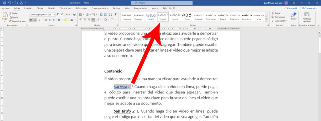 De igual manera hacemos con los otros títulos principales. Ahora vamos a hacer lo mismo pero con los sub títulos. Esta vez aplicaremos el estilo Título 2