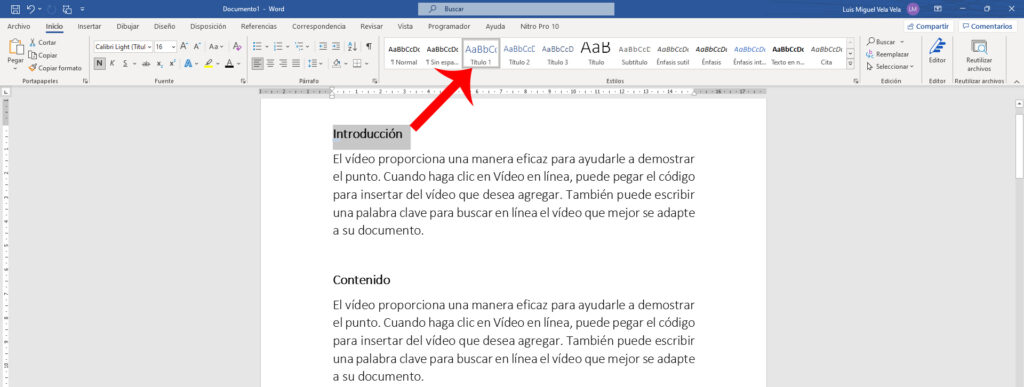 Seleccionamos el título en nuestro documento Word y luego nos dirigimos a la pestaña inicio, en el grupo estilos damos clic en Título 1 o Título 2 o Título 3 dependiendo del nivel que queremos otorgarle. En este caso son los títulos principales así que le aplicamos el título 1